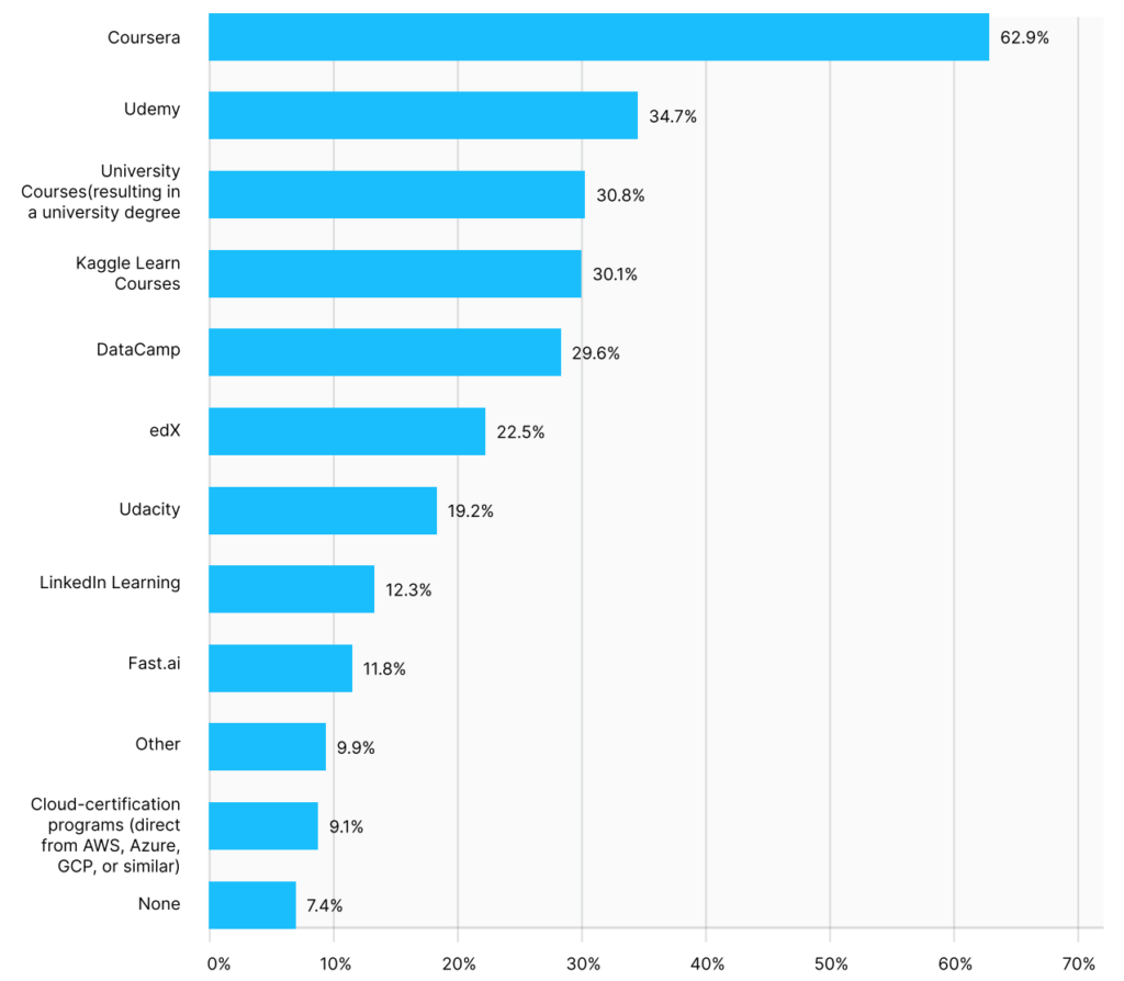 In this survey,Coursera , Udemy , and Kaggle Learn are the most common learning platforms.