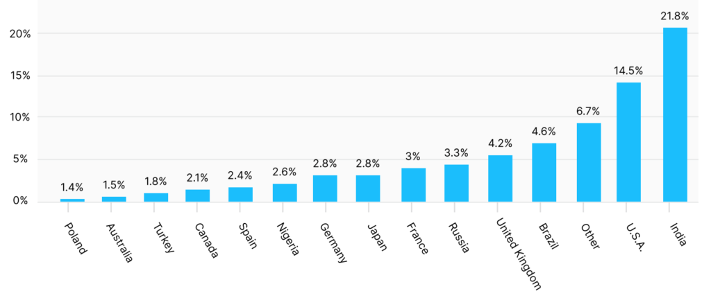 Country: India and the United States top the list