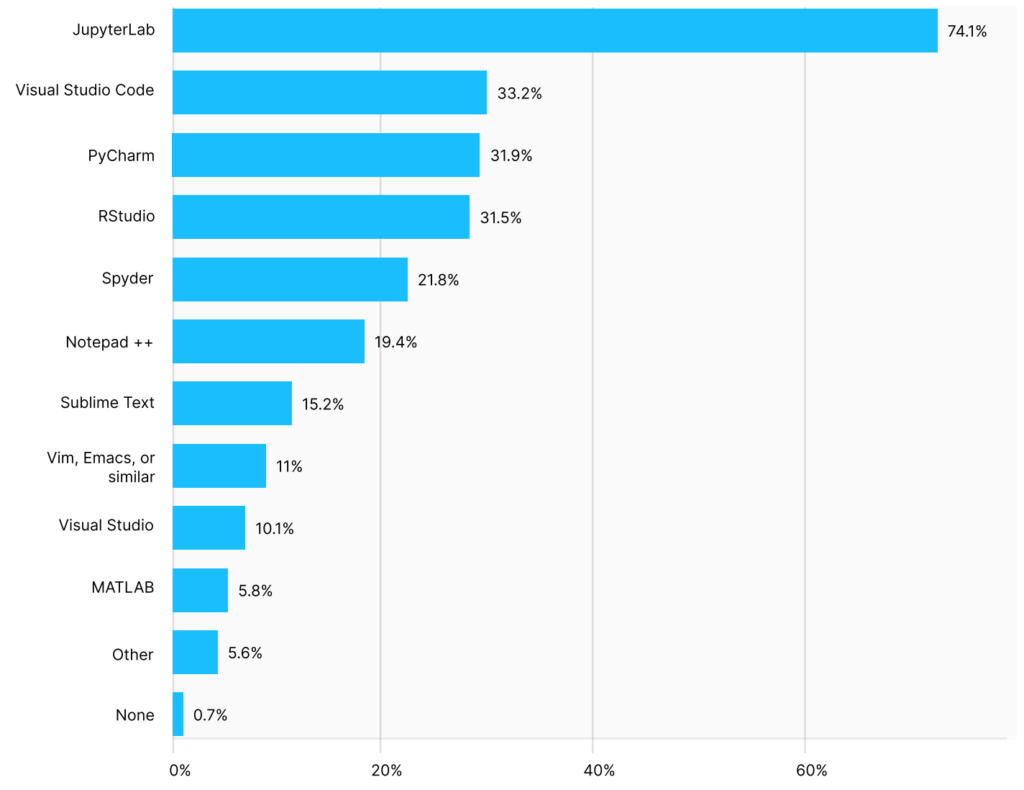 The report shows that JupyterLab IDE remains the tool of choice for data scientists, with about three-quarters of data scientists using it.However, this number is down from 83% last year. Visual Studio Code ranked second, just above 33%.