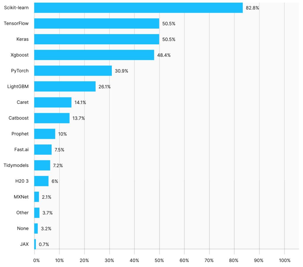 Python-based machine learning libraries still dominate. Among them,Scikit-learn is a super weapon that works for most projects and ranks #1, with 4 out of 5 data scientists using it.