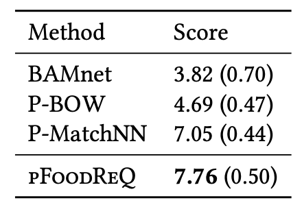 For each question, the four models, BAMnet, P-BOW, P-MatchNN and pFoodReQ, were fed in random order and the answers were obtained. Each answer contained the top three recipes (if more than three recipes were retrieved), the ingredient list and the nutritional value.