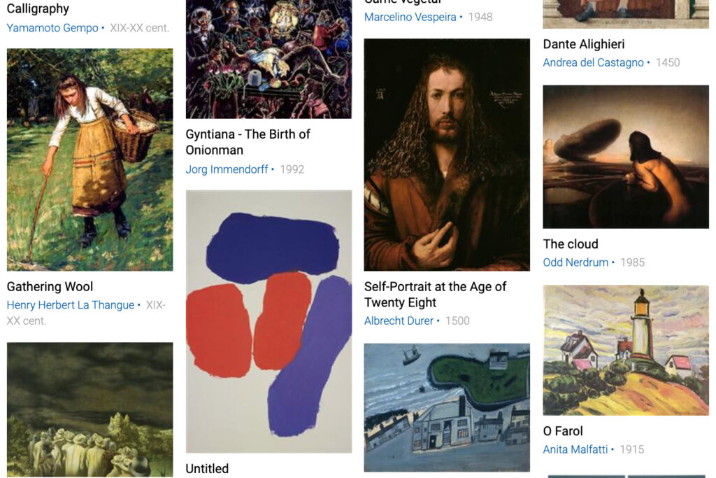 WikiArt homepage display, works can be searched by genre, style, or artist nationality, era, etc.