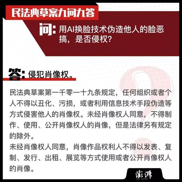 According to Article 1019 of the Civil Code of the People's Republic of China: "No organization or individual may infringe upon the portrait rights of others by means of vilification, defacement, or forgery using technical information means." (Part 4 Personal Rights Chapter 4 Portrait Rights)
