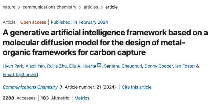 Metal-organic frameworks (MOFs) have great potential in carbon dioxide capture. The generative AI high-performance framework GHP-MOFassemble proposed by researchers can quickly assemble more than 120,000 new candidate MOFs one by one within 30 minutes by assembling randomly generated MOFs structures combined with molecular dynamics simulation and Monte Carlo simulation.