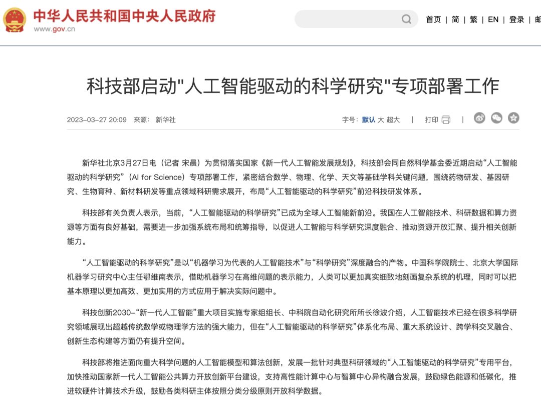 Subsequently, the Chinese government and departments at all levels also issued a series of favorable policies for AI4S. In March 2023, in order to implement the national "New Generation Artificial Intelligence Development Plan", the Ministry of Science and Technology, together with the National Natural Science Foundation of China, launched the "AI for Science" special deployment work.Closely integrating key issues in basic disciplines such as mathematics, physics, chemistry, and astronomy, we will build a cutting-edge scientific research and development system driven by artificial intelligence.