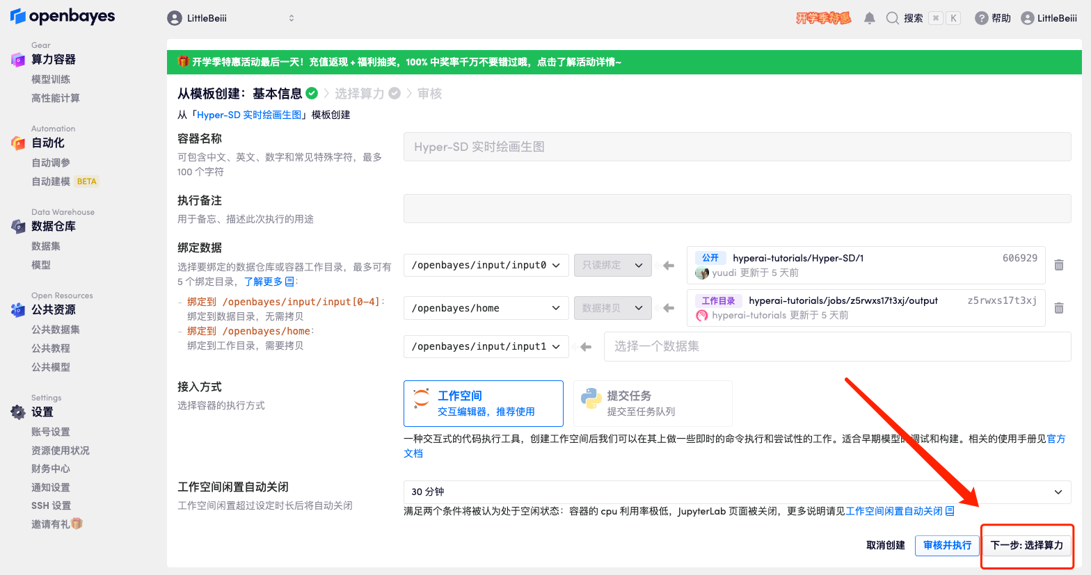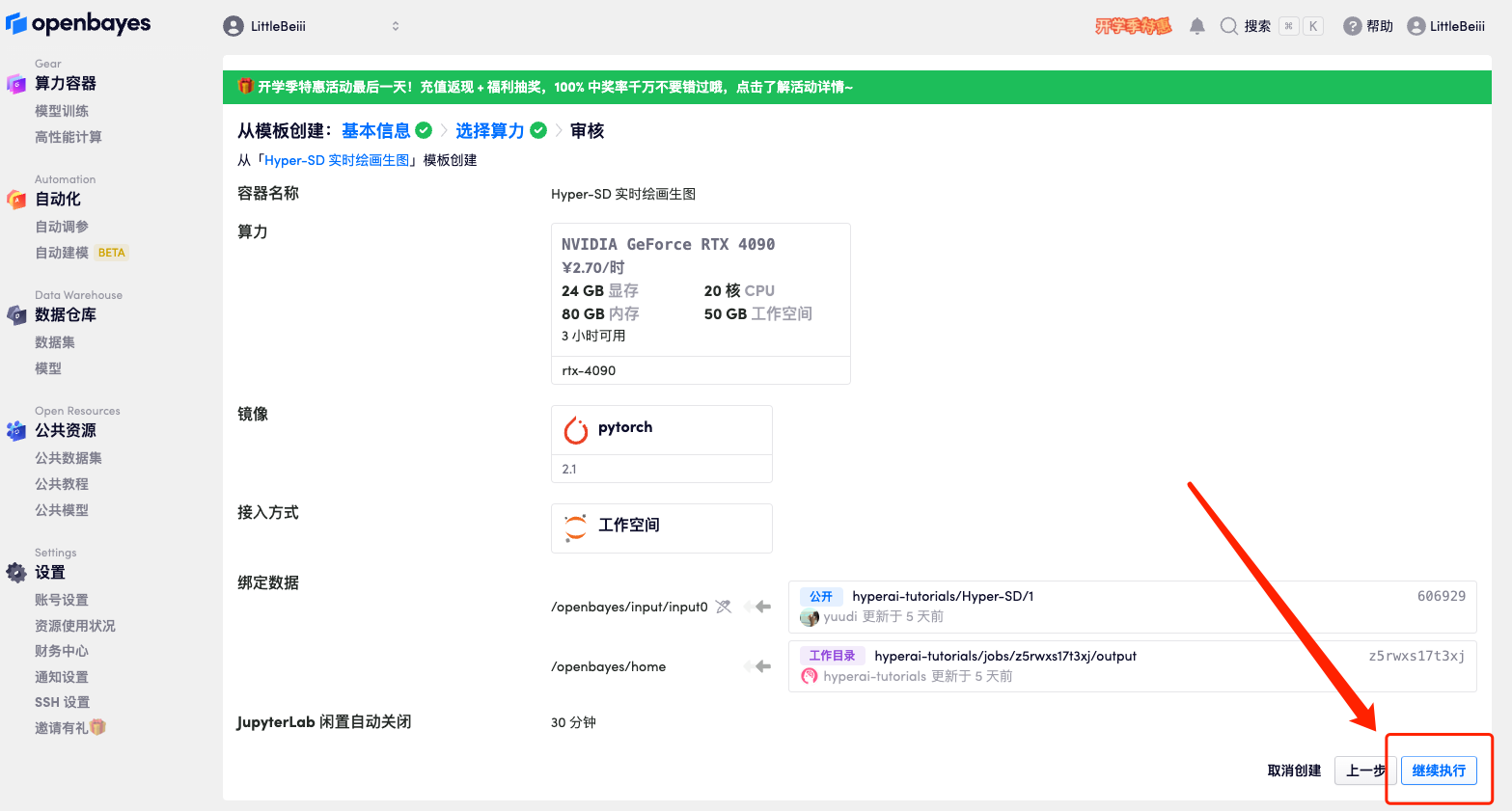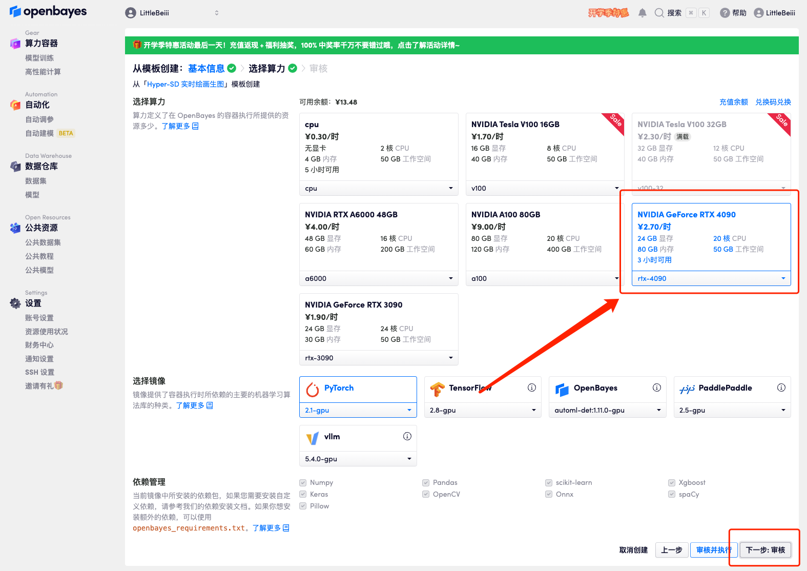 4. After the page jumps, select "NVIDIA RTX 4090" and "PyTorch" image, and click "Next: Review".New users can register using the invitation link below to get 4 hours of RTX 4090 + 5 hours of CPU free time!