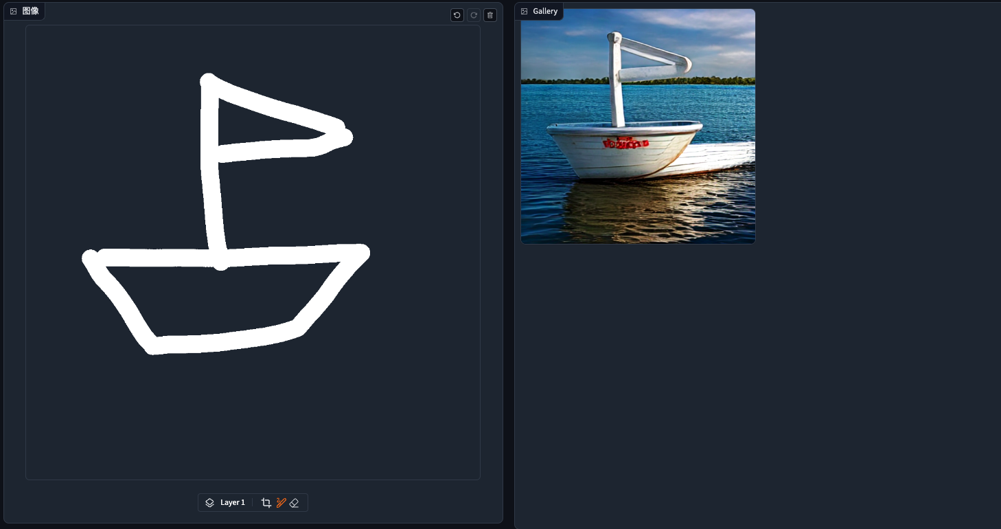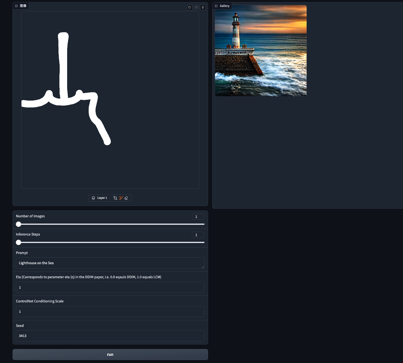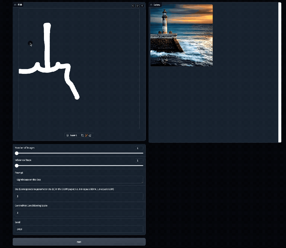 - After opening the Demo, simply draw a shape in the drawing area, enter the prompt (for example, Lighthouse on the sea), and click "run" to generate an image.