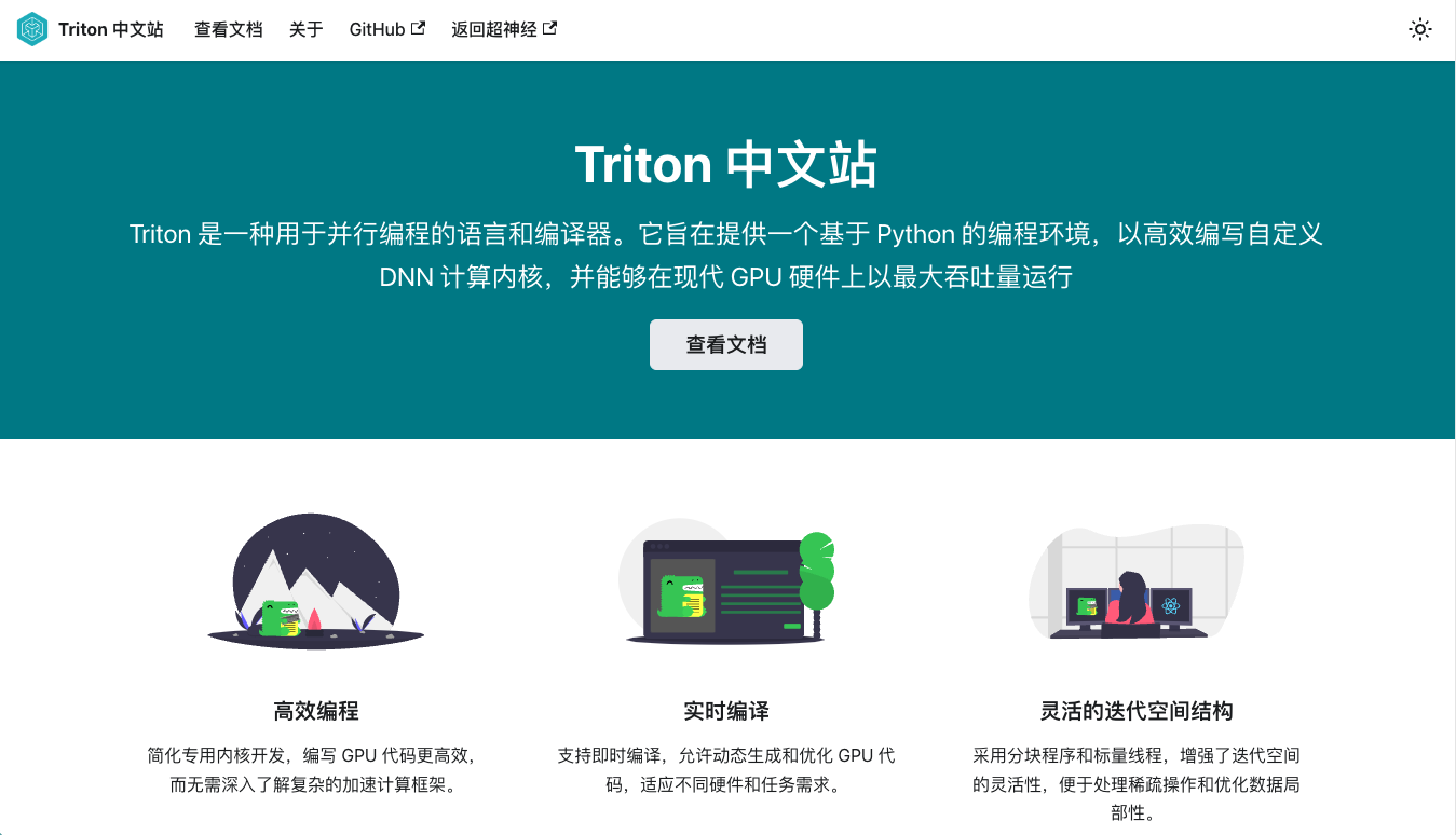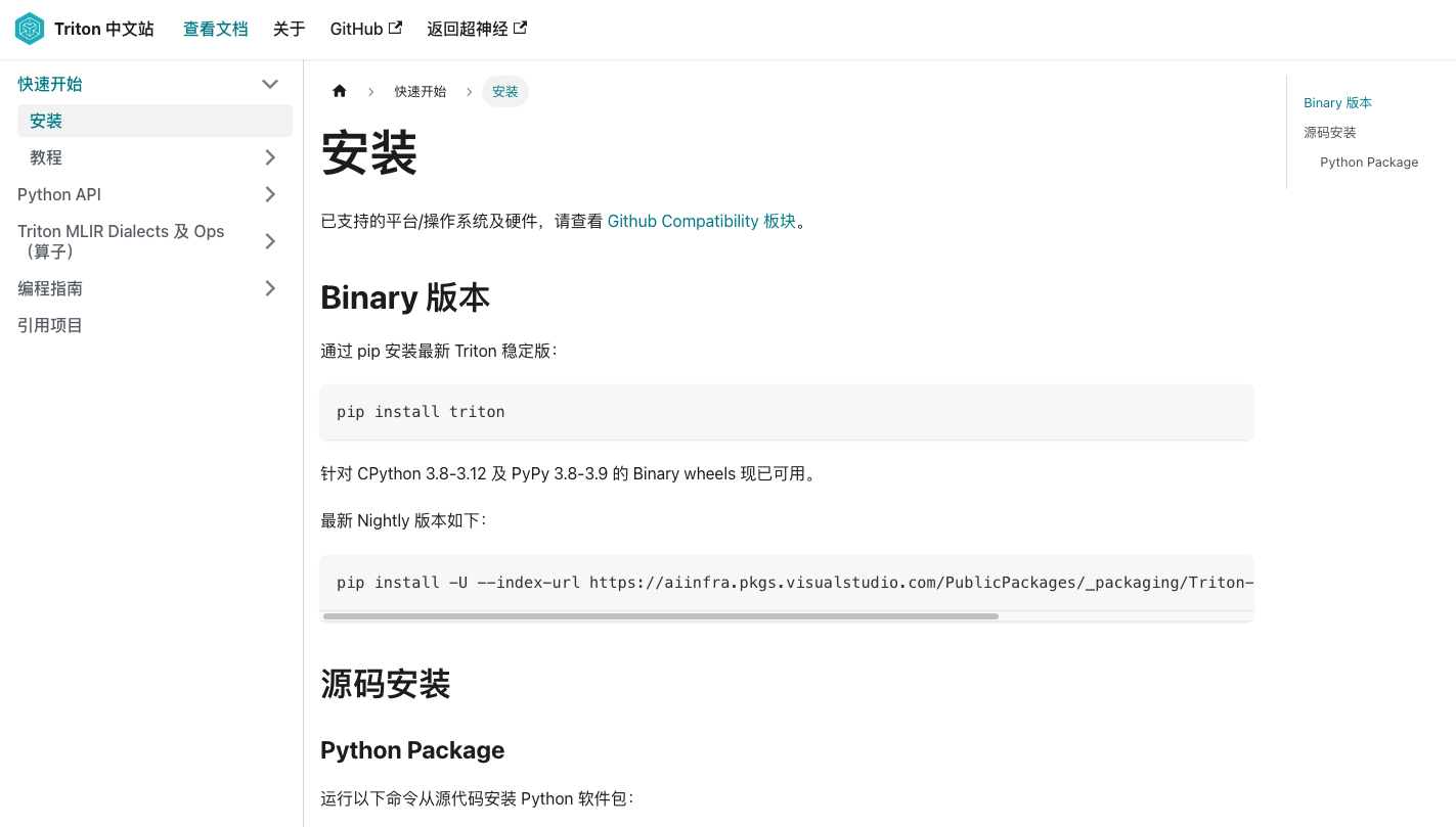 The Triton Chinese documentation is based on the English documentation and has been adjusted to a localized structure.It is more in line with the reading habits of Chinese developers and provides a series of detailed and practical guides from Triton installation to application development.