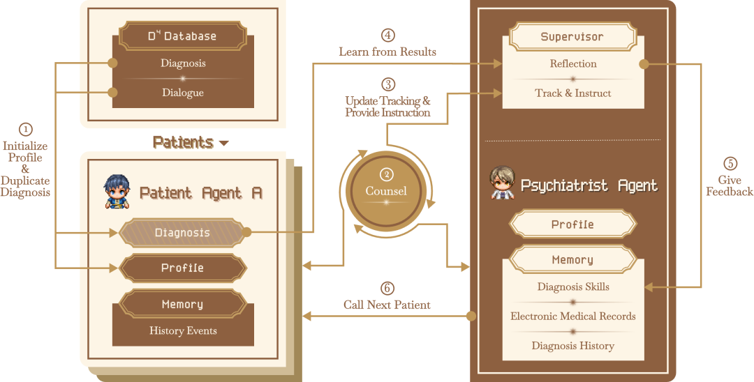 This research group proposed the "Big Model Agent Psychological Clinic", which aims to build an agent-based mental health dialogue platform. By simulating the dialogue between patients and psychiatrists, the big model intelligent body in the platform can evolve itself and optimize the performance.