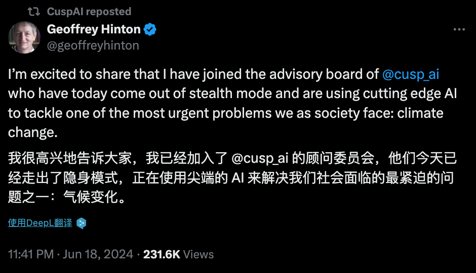 After the award was announced, CuspAI immediately congratulated Hinton, who was then an advisor to the company's board of directors, which once again attracted public attention to this startup company.