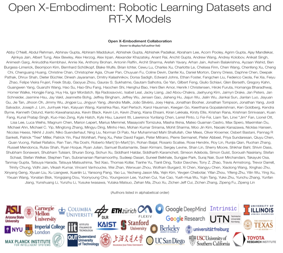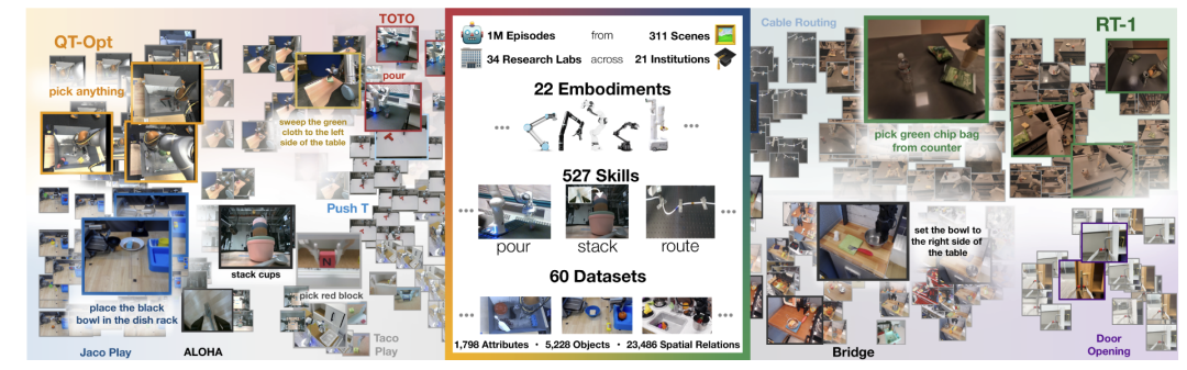 It is reported that Open X-Embodiment is the largest open source real robot dataset to date.It covers 22 different robot types, from single-arm robots to dual-arm robots to quadruped robots, with more than 1 million robot trajectories and 527 skills (160,266 tasks). The researchers demonstrated that models trained on multiple robot type data performed better than models trained on only a single robot type data.