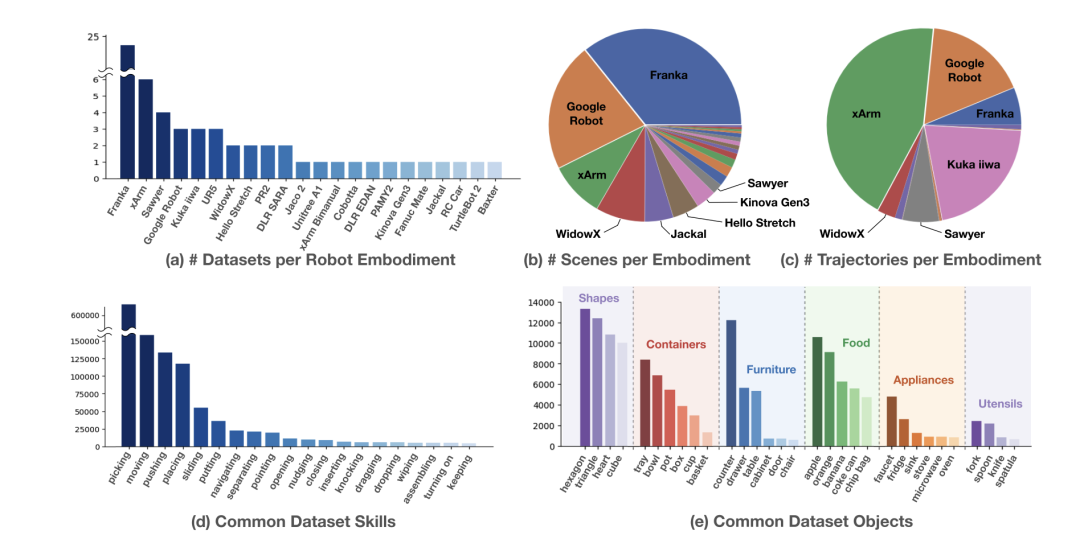 The distribution of the Open X-Embodiment dataset is shown in the figure below.Figure (a) shows the distribution of 22 robot data sets, among which Franka is the most common. Figure (b) shows the distribution of robots in different scenarios, with Franka being the dominant robot, followed by Google Robot. Figure (c) shows the distribution of trajectories for each robot, with xArm and Google Robot contributing the most trajectories. Figures (d, e) show the skills that robots have and the objects they use, including picking, moving, pushing, placing, etc., and a wide variety of objects including household appliances, food, and tableware.