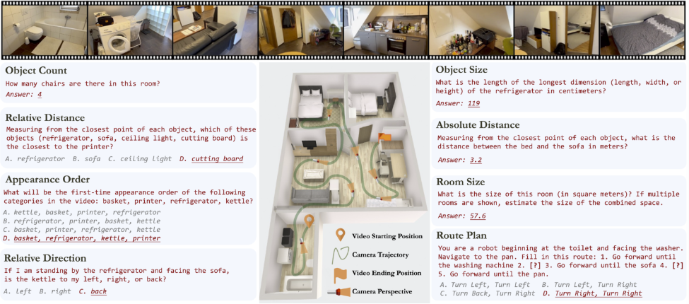 The dataset contains more than 5k question-answer pairs, covering nearly 290 real indoor scene videos, involving a variety of environments such as residences, offices, and factories, and covering multiple issues such as object recognition, position relationship, and action prediction.