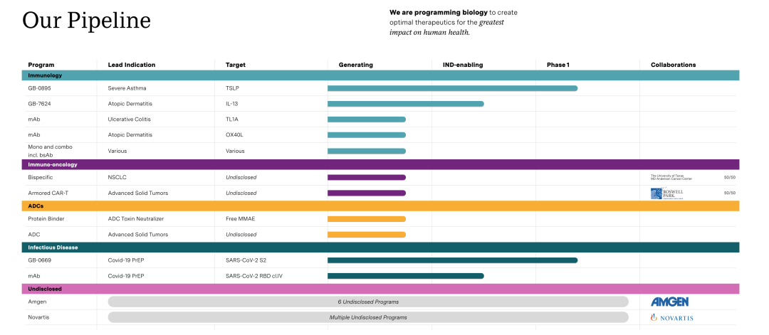 Currently, Generate has built a rich pipeline covering the fields of tumors, immune-related diseases and infectious diseases. Two of its candidate drugs have entered Phase I clinical trials, including GB-0895, a TSLP monoclonal antibody for asthma, and GB-0669 for Covid-19 PrEP.