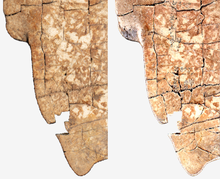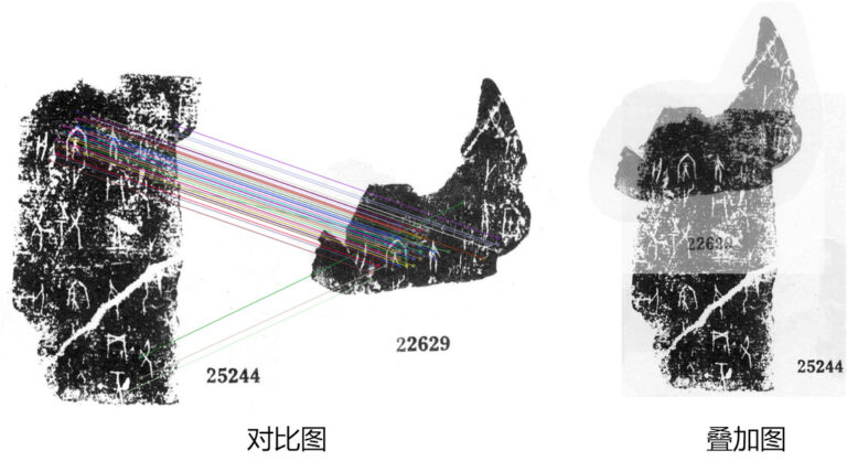 As shown in the following figure, the left side is an earlier oracle bone rubbing that is not complete. The right side is a later rubbing, with only a part of the oracle bone remaining. Although it is complete, it is still incomplete. By overlapping the two rubbings, a more complete image of the oracle bone is obtained, especially the complete display of the oracle bone text in the upper right part, which directly provides new material for oracle bone research.