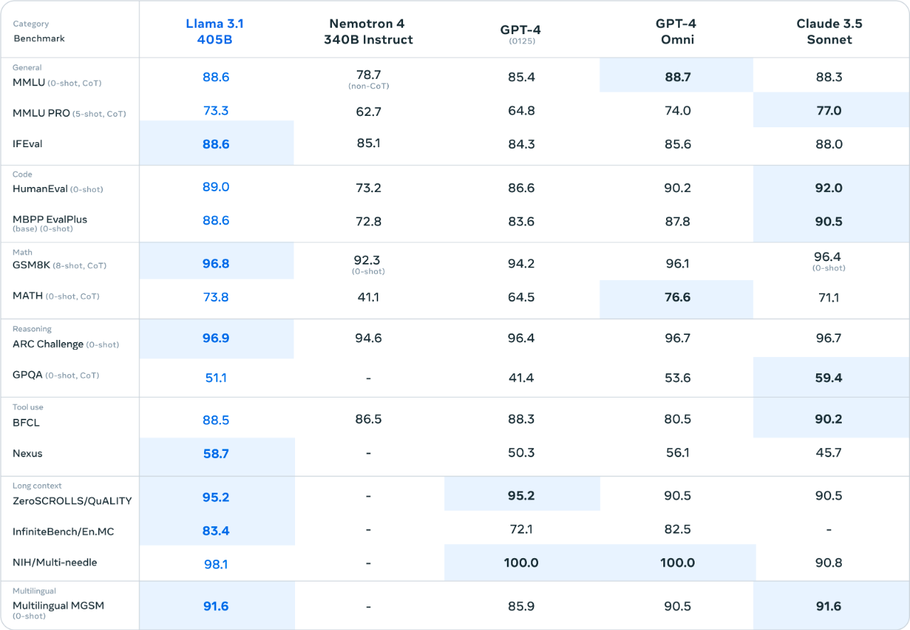 LLaMa 3.1 is comparable to or even better than ChatGPT and Claude. On July 13, 2024, Meta launched an updated version of LLaMA 3.1 and released benchmark comparison results of the model with mainstream models from companies such as OpenAI, Anthropic, and Mistral.