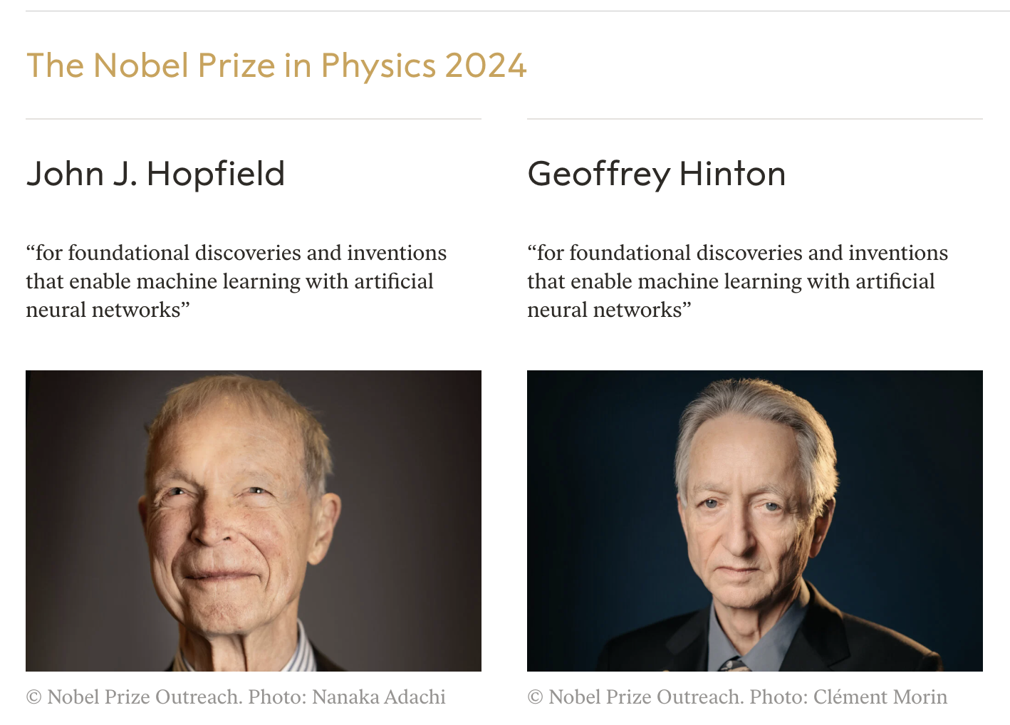 On October 8 and 9, 2024, the Nobel Prizes in Physics and Chemistry were awarded for AI-related research for the first time. The 2024 Nobel Prize in Physics was awarded to Princeton University physicist and professor emeritus John J. Hopfield and University of Toronto professor emeritus and former Google researcher Geoffrey Hinton for their development of machine learning techniques using artificial neural networks.