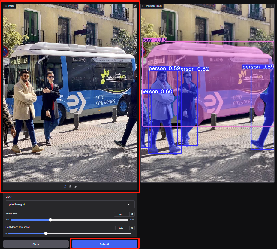 2. Enter the instance segmentation demo page, upload the image and adjust the parameters, then click "Submit" to complete the segmentation operation. Even with occlusion, YOLOv11 can do an excellent job of accurately segmenting the person and outlining the outline of the bus.