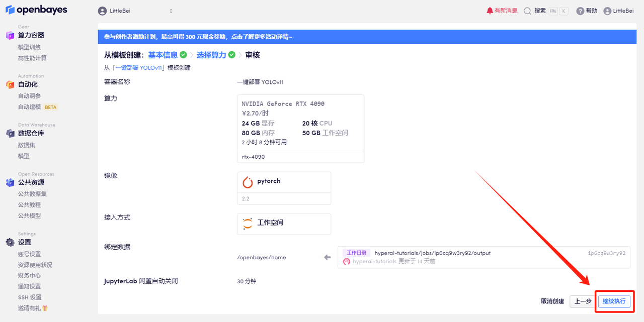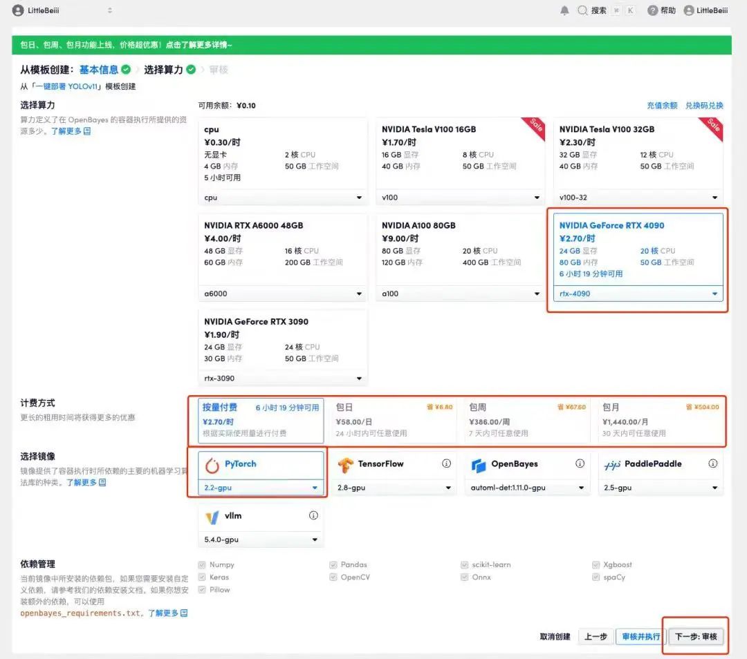 4. After the page jumps, select "NVIDIA RTX 4090" and "PyTorch" images. Users can choose "Pay as you go" or "Daily/Weekly/Monthly Package" according to their needs. After completing the selection, click "Next: Review".New users can register using the invitation link below to get 4 hours of RTX 4090 + 5 hours of CPU free time!