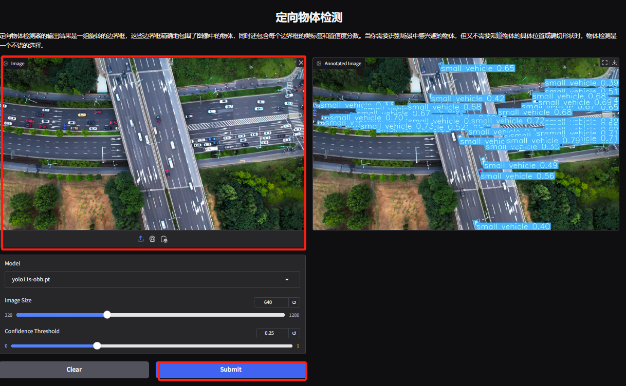 5. On the Directed Object Detection Demo page, upload an image and adjust the parameters, then click “Submit” to identify the specific location and classification of the object.