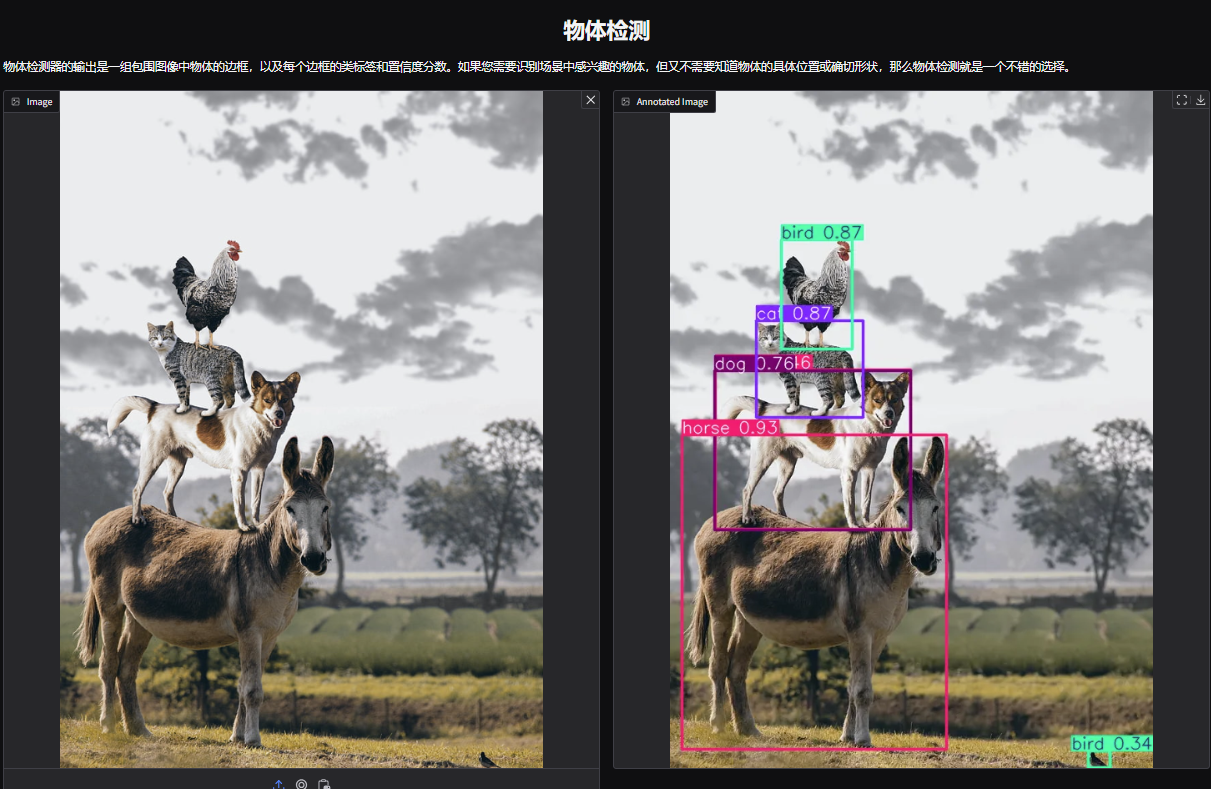1. Open the YOLOv11 object detection demo page. I uploaded a picture of animals stacked up in a circle, adjusted the parameters, and clicked "Submit". You can see that YOLOv11 has accurately detected all the animals in the picture. There is a bird hidden in the lower right corner! Did you notice it?