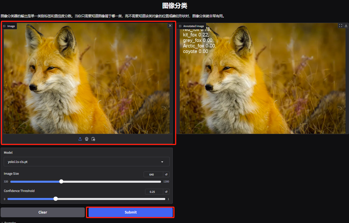 3. Enter the object classification demo page. The editor uploaded a picture of a fox. YOLOv11 can accurately detect that the specific species of the fox in the picture is a red fox.