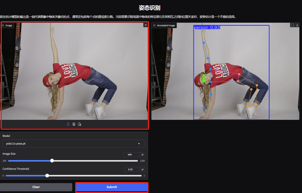 4. Enter the gesture recognition demo page, upload a picture, adjust the parameters according to the picture, and click "Submit" to complete the gesture analysis. You can see that it accurately analyzes the exaggerated body movements of the characters.