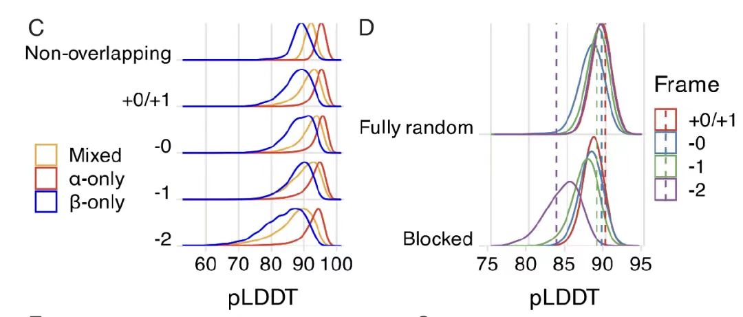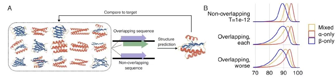 When exploring the feasibility of overlapping highly ordered protein backbone structures,As shown in Figure A below, researchers used the ProteinMPNN structure conditional generation model to generate 56,250 overlapping designs and 33,000 non-overlapping designs for 15 de novo generated main chain structures (covering α, β and mixed folding categories). As shown in Figure B below, the AlphaFold2 evaluation data shows thatThe average pLDDT value for the overlapping design was 90.2, which was close to the 92.0 for the nonoverlapping design.