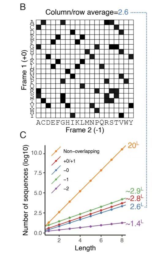 As shown in Figure B below, by analyzing the amino acid compatibility matrix of the -0 framework, it was found that there are an average of 2.6 compatible amino acid choices for a single position in the reference framework, forming 52ⁿ (n is the sequence length) potential overlapping sequence pairs, highlighting the design space brought by the degeneracy of the genetic code. The degrees of freedom of other frameworks were quantified with the help of Monte Carlo approximation, as shown in Figure C below. The results show that the +1 and -1 frameworks have higher degrees of freedom (about 2.8 and 2.9, respectively), while the -2 framework has a significantly limited degree of freedom (about 1.4) due to the low efficiency of codon degeneracy.