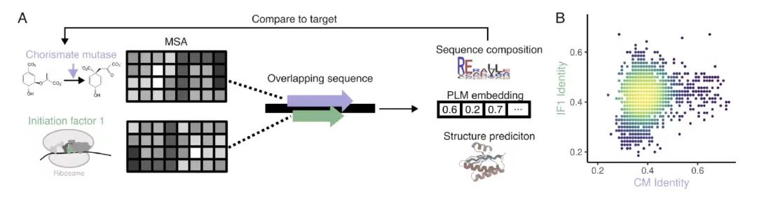 In the homology-based OLG design evaluation,As shown in Figure A below, the research team selected bacterial shikimate mutase (CM) and translation initiation factor 1 (IF1) as targets, used the EvoDiff-MSA generation model, and used multiple sequence alignment (MSA) as conditional context to generate 3,307 completely overlapping sequence designs through position-by-position masking and constrained sampling.