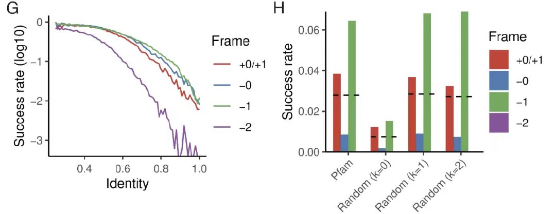 In evolutionary accessibility studies,The research team started with a seed protein sequence with a fixed number of mutations. As shown in the figure GF below,The study found that even under the extreme condition of zero mutation, about 1% designs can still achieve high structural stability (pLDDT>85, TM>0.7);When natural Pfam sequences were used as parents, the success rate increased to 3%, and this result was consistent with random sequences that retained first-order compositional deviations. This fully demonstrates that highly optimized natural proteins can accommodate new proteins in alternative frameworks without major sequence changes, verifying the feasibility of OLG at the evolutionary level.