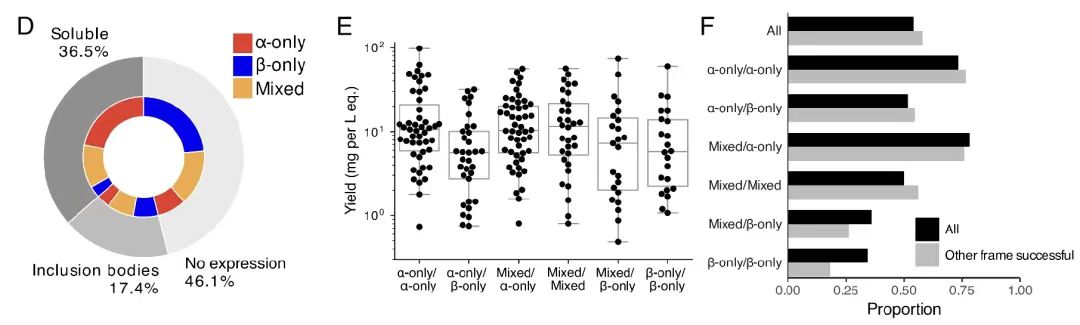 Furthermore, as shown in Figures DF below, the success rate varied depending on the secondary structure content of the protein, with α-helical proteins having the highest success rate. In addition, overlapping pairs of 31% were successfully purified, and the success of one framework did not affect the success of the other framework.These results further support the high feasibility and experimental validation rate of the OLG sequences, demonstrating the effectiveness of the algorithm in designing functional and structurally stable overlapping proteins.