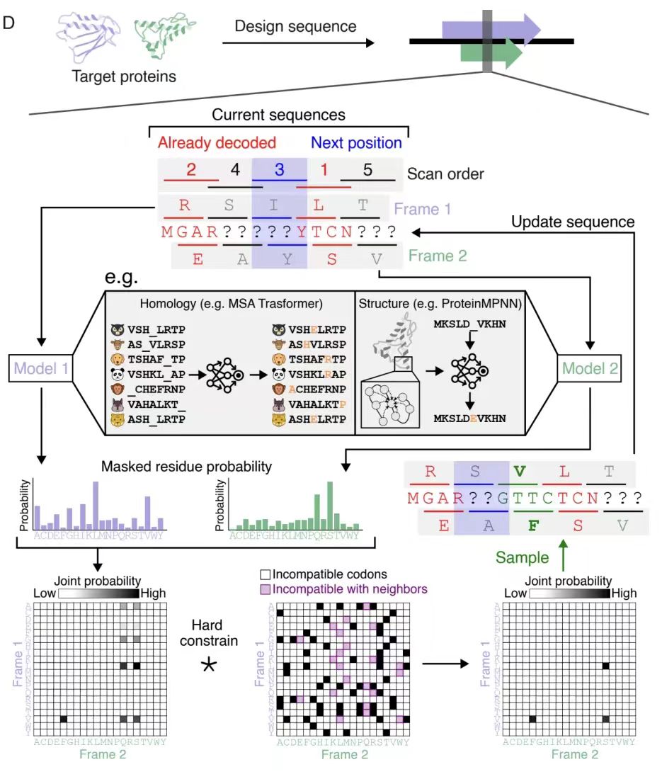 Finally, as shown in Figure D below, the algorithm systematically scans the sequence positions (Scan order) and dynamically updates the joint probability matrix in each scan in combination with the adjacent amino acid constraints.After multiple rounds of iterations, the generated overlapping sequence pairs are ensured to meet the compatibility of the framework.This strategy can be extended to complex frameworks with phase offsets, optimizing the design quality by biasing the scan order and providing key constraints for iterative decoding of the generative model.