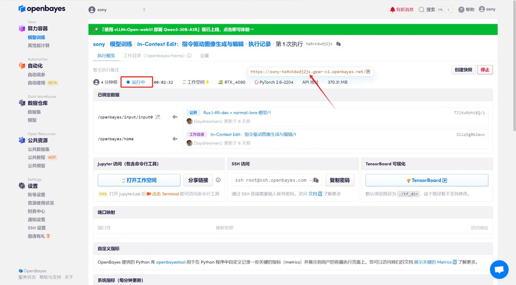 4. Wait for resources to be allocated. The first clone will take about 2 minutes. When the status changes to "Running", click the jump arrow next to "API Address" to jump to the Demo page. Due to the large model, it will take about 3 minutes to display the WebUI interface, otherwise "Bad Gateway" will be displayed. Please note that users must complete real-name authentication before using the API address access function.