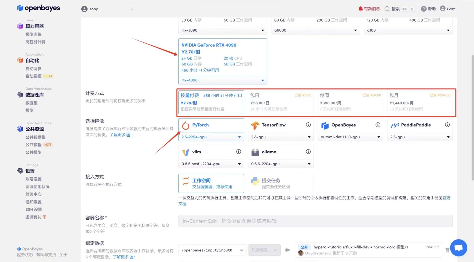 3. Select "NVIDIA GeForce RTX 4090" and "PyTorch" images. The OpenBayes platform provides 4 billing methods. You can choose "Pay as you go" or "Pay per day/week/month" according to your needs. Click "Continue". New users can register using the invitation link below to get 4 hours of RTX 4090 + 5 hours of CPU free time!