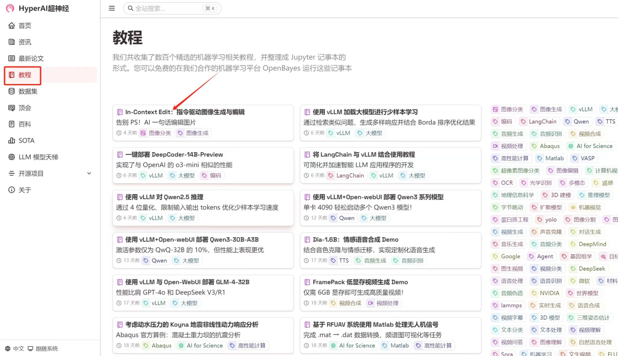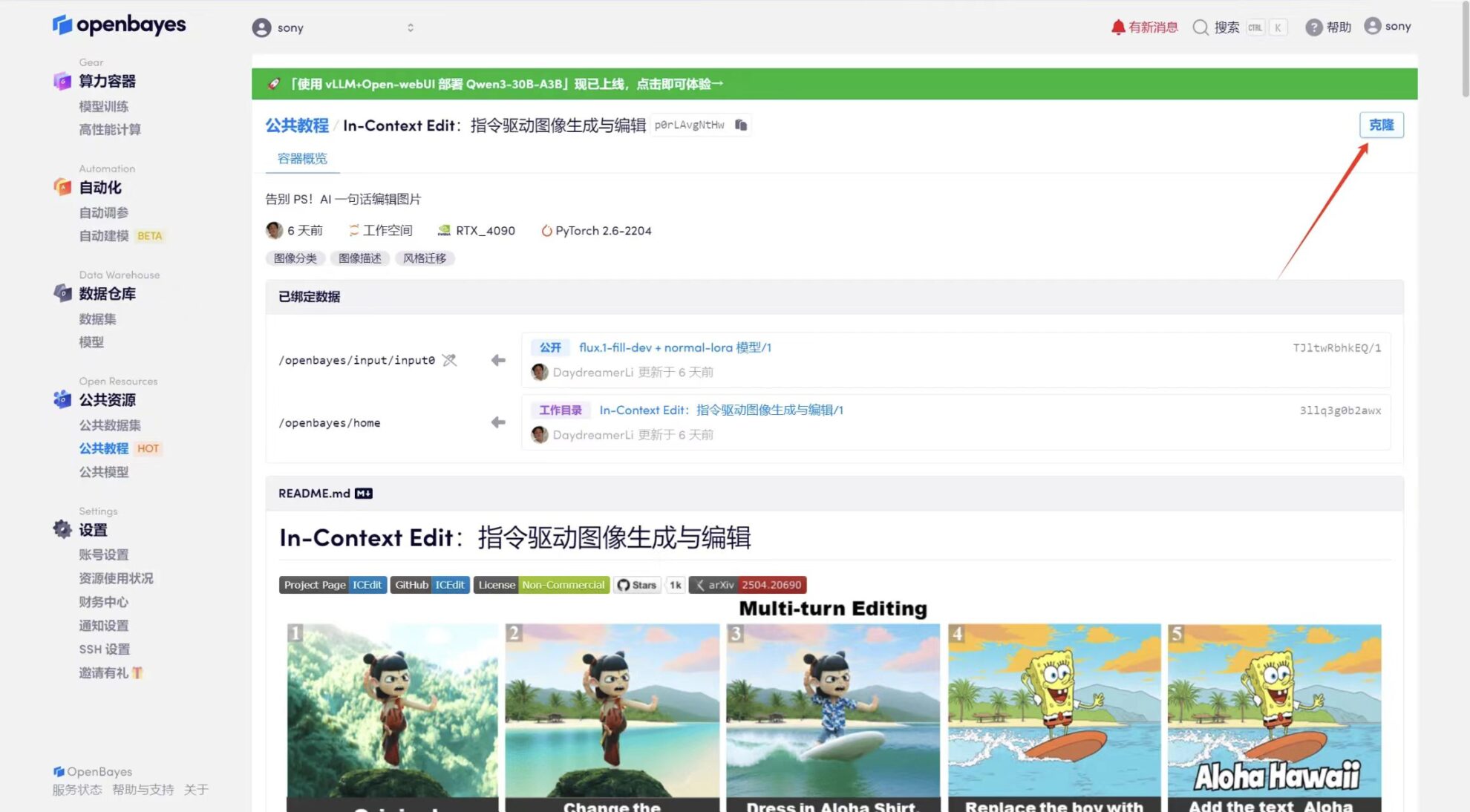 1. After entering the hyper.ai homepage, select the "Tutorial" page, select "In-Context Edit: Command-driven Image Generation and Editing", and click "Run this tutorial online".