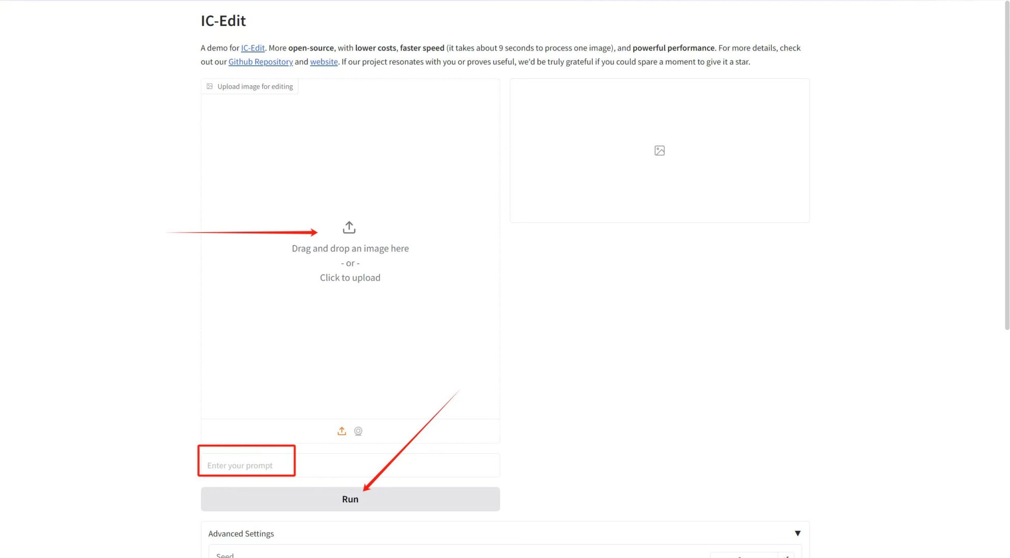 Upload the image in "Upload image for editing", then enter the prompt word in the text box, and finally click "Run" to generate.