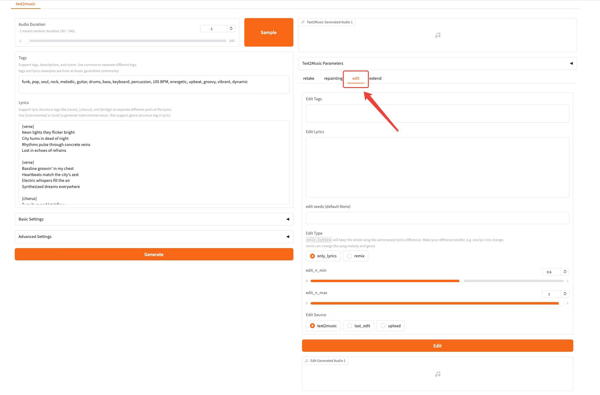 * Edit Type: Edit type, you can choose "only_lyrics" mode (keep the original melody) or "remix" mode (change the melody)