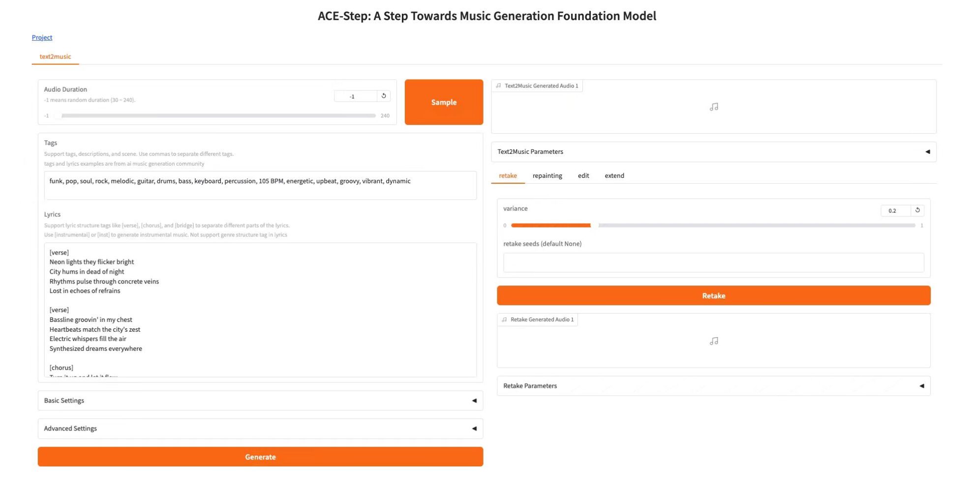 Current music generation models face an inherent trade-off between generation speed, musical coherence, and controllability. For example,LLM-based models (e.g., Yue, SongGen) perform well in lyrics alignment but suffer from slow inference speed and structural artifacts.On the other hand, diffusion models (such as DiffRhythm) can achieve faster synthesis speeds, but they usually lack long-distance structural coherence. In response to this, the artificial intelligence company StepFun and the digital music platform ACE Studio jointly launched a basic music generation model ACE-Step-v1-3.5B, which was open sourced on May 7, 2025.The model can synthesize up to 4 minutes of music in just 20 seconds on an NVIDIA A100 GPU, which is 15 times faster than the LLM-based baseline method.While achieving excellent musical coherence and lyrical alignment in terms of melodic, harmonic, and rhythmic metrics.