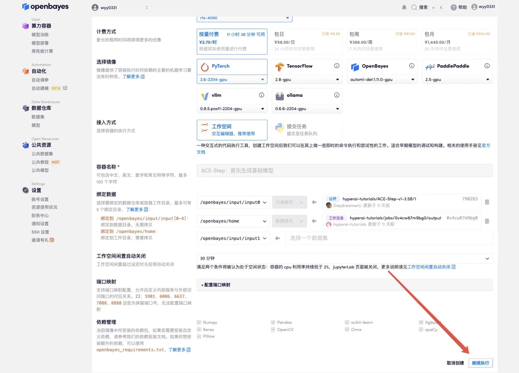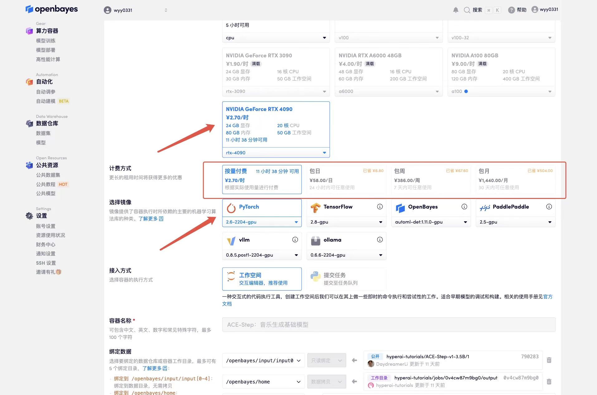 3. Select "NVIDIA GeForce RTX 4090" and "PyTorch" images. The OpenBayes platform provides 4 billing methods. You can choose "Pay as you go" or "Pay per day/week/month" according to your needs. Click "Continue". New users can register using the invitation link below to get 4 hours of RTX 4090 + 5 hours of CPU free time!
