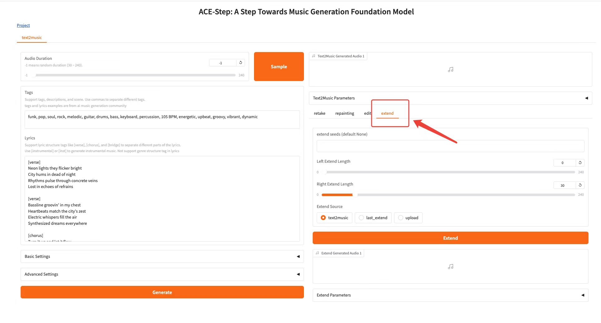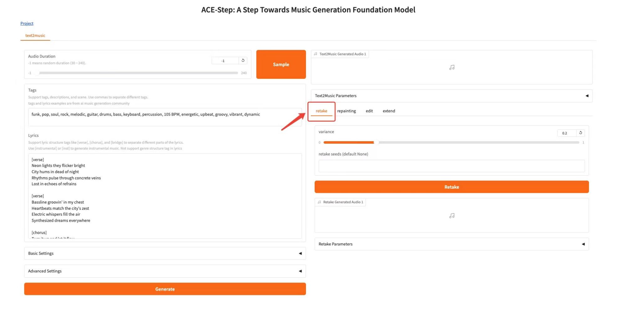 The project provides multi-tasking creation panels: Text2Music Tab, Retake Tab, Repainting Tab, Edit Tab and Extend Tab.