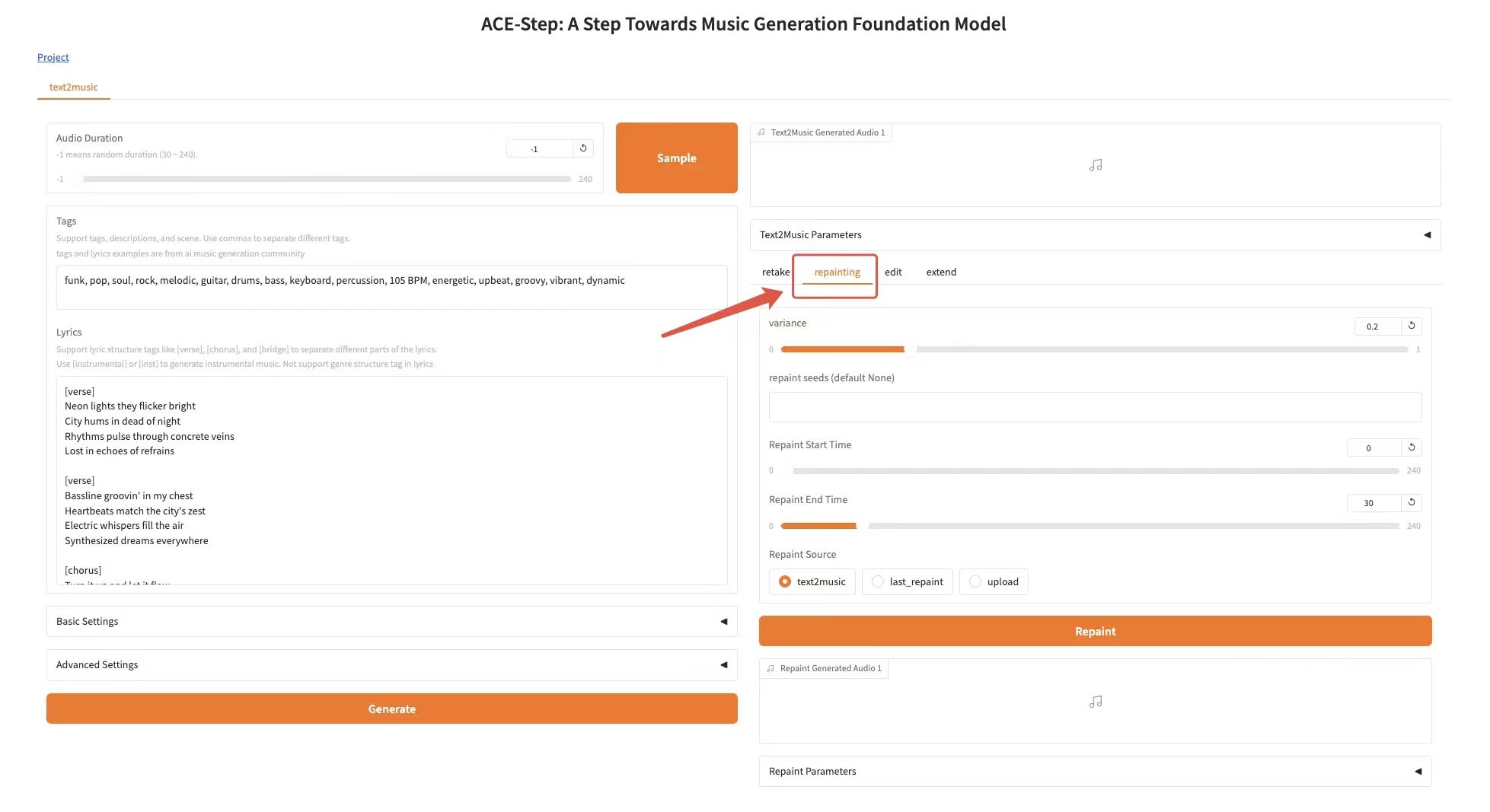 * Repaint Source: Select the source audio (text2music, last_repaint or upload)