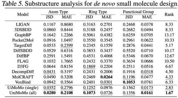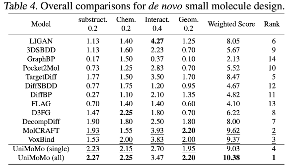 The results show thatUniMoMo, trained uniformly, has achieved comprehensive superiority in all molecular types.Not only does it excel in structural restoration accuracy, but it also achieves significant improvements in key geometric rationality and the quality of interaction with the target.