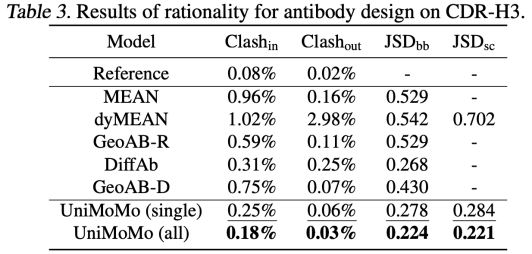 Similarly, UniMoMo(all), which is jointly trained using data from different molecular types, outperforms the version trained only using antibody data in all indicators.This shows that unified modeling does help the model learn more universal and transferable spatial laws of molecular structures.This result highlights the commonalities in structural modeling between different molecular types and verifies the significant value of cross-domain data fusion in improving generation quality.