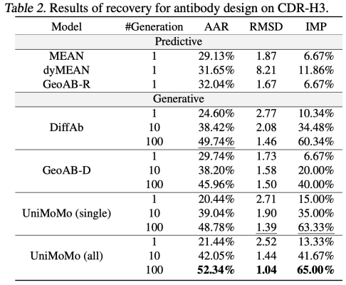 In the antibody design task, UniMoMo also shows strong performance. Compared with existing methods such as MEAN, dyMEAN and DiffAb,UniMoMo surpasses all other targets in terms of key indicators such as recall of naturally bound sequences and structures (AAR and RMSD) and binding energy improvement (IMP).Especially in the evaluation of multiple sampling generation, UniMoMo is able to generate antibody fragments close to the natural conformation with a higher probability, showing its good exploration ability in the antibody structure space.
