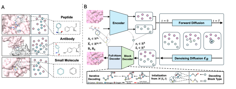 Therefore, in the face of different disease mechanisms, target characteristics and drug requirements, the types of molecules suitable for use are different. Existing generation methods usually only model a certain type of molecule (such as small molecules, peptides or antibodies).It can neither meet diverse therapeutic needs nor utilize the commonalities between different molecules to improve model performance.