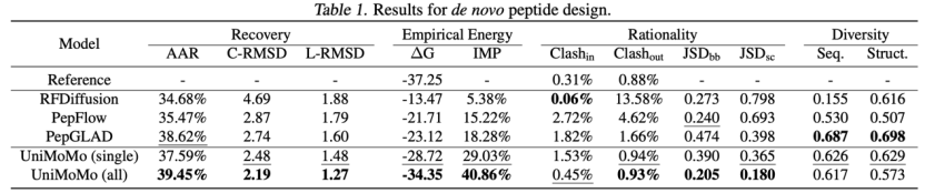 UniMoMo can also generate structures with lower Rosetta binding energies.This reflects its stronger modeling ability for the geometric features of protein binding sites.In addition, UniMoMo also showed leading performance in geometric rationality indicators such as the consistency of dihedral angle distribution (JSD of backbone/sidechain torsions) and atomic-level spatial conflicts (clash rate) that measure the quality of peptide conformations. Moreover, UniMoMo (all) trained with all data consistently outperformed the model trained only with peptide data in various indicators.The ability of UniMoMo to learn and generalize across molecular species is demonstrated.