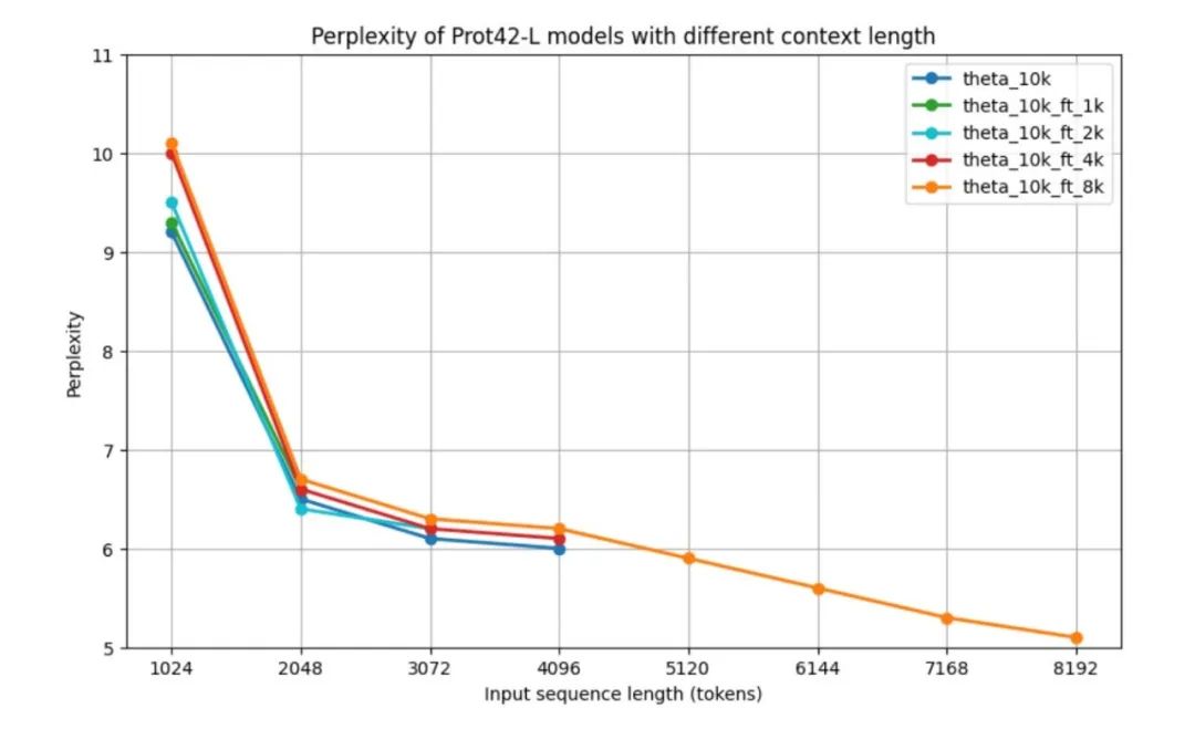 To evaluate the performance of the Prot42 model before validation on downstream tasks, the researchers used the standard measure of parametric complexity (PPL) for evaluating autoregressive language models, namely the performance of the Prot42 model at different context lengths.All models have relatively high perplexity at 1,024 tokens, but improve significantly to around 6.5 at 2,048 tokens.Results show that the base model and models fine-tuned for shorter contexts exhibit similar performance patterns across their respective maximum context lengths. The performance of the 8k context model is particularly striking - although its perplexity is slightly higher for medium-length sequences (2,048 – 4,096 tokens), it is able to handle sequences up to 8,192 tokens and achieves a minimum perplexity of 5.1 at the maximum length.After more than 4,096 tokens, the perplexity curve shows a downward trend.As shown in the figure below.