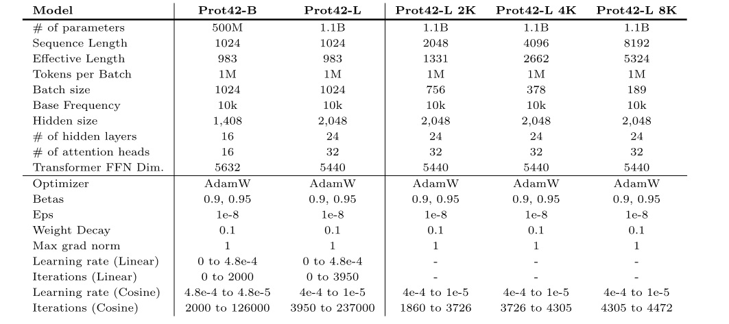 * Prot42-L:The large version has 1.1 billion model parameters and also supports a maximum sequence length of 1,024 amino acids.The context length of Prot42-L was gradually extended from 1,024 amino acids to 8,192 amino acids.In this process, a gradually increasing context length and a constant batch size (1 million non-filled tokens) were used to ensure the stability and efficiency of the model when processing long sequences, significantly improving the model's ability to process long sequences and complex protein structures.Prot42-L also contains 24 hidden layers, each with 32 attention heads.The hidden layer dimension is 2,048.