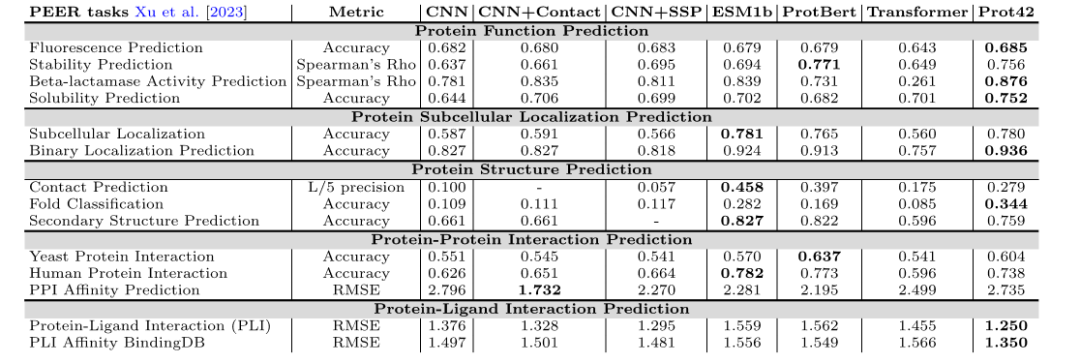 In the protein structure prediction task,The Prot42 model achieved excellent results in contact prediction, folding classification, and secondary structure prediction.These results indicate that the Prot42 model is able to capture subtle differences in protein structure, providing strong support for complex biological interaction modeling and pharmaceutical applications.